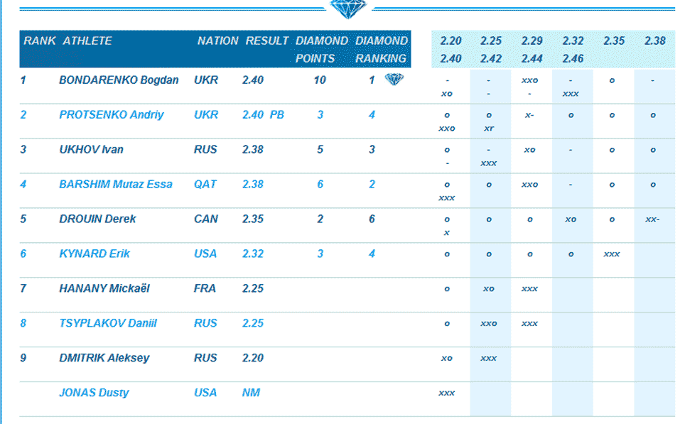 1 | Bohdan BONDARENKO | UKR | 89 | 2.4 |