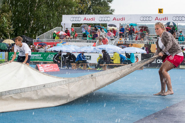 Высота 2,30 м покорилась с третьей попытки, и зрители были вознаграждены за своё терпение прекрасным представлением под дождем.