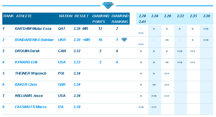 Третьим стал Дерек Друин из Канады (2,32 м). По попыткам ему уступил американец Эрик Кинард. Перед финалом «Бриллиантовой лиги» Бондаренко продолжает лидировать (16 очков). Баршим отстает на четыре пункта.