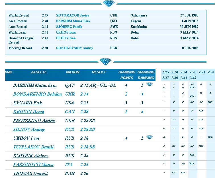 Богдан Бондаренко в прыжках в высоту показал результат 2,34 м, пропустив вперед Мутаза Баршима который преодолел 2,41 м.