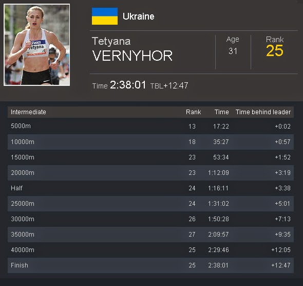 В утренней программе Татьяна Вернигор стартовала на марафонской дистанции. С результатом 2:38:01 Татьяна финишировала 25-й.