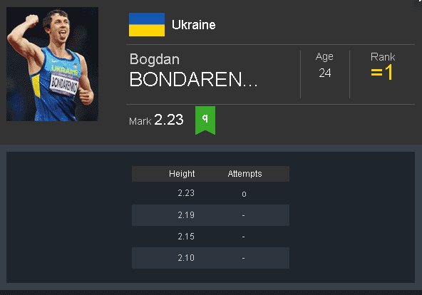 В утренней программе Чемпионата состоялась квалификация в прыжках в высоту. Харьковчанин Богдан Бондаренко, сделав всего один прыжок на 2,23 м, обеспечил себе выход в финал соревнований, который состоится 15 августа в 20:46.