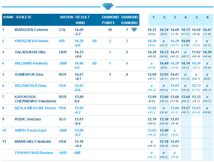 Ольга Саладуха - тройным на третью ступень пьедестала. Анна Князева - впервые за Израиль. 9 этап Бриллиантовой лиги. Париж. 6 июля 2013