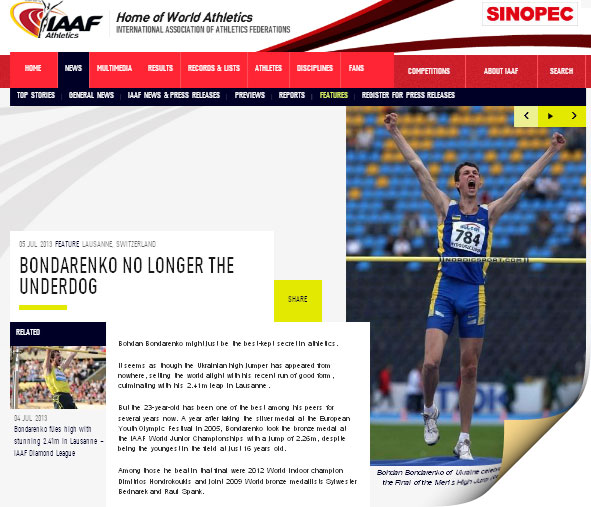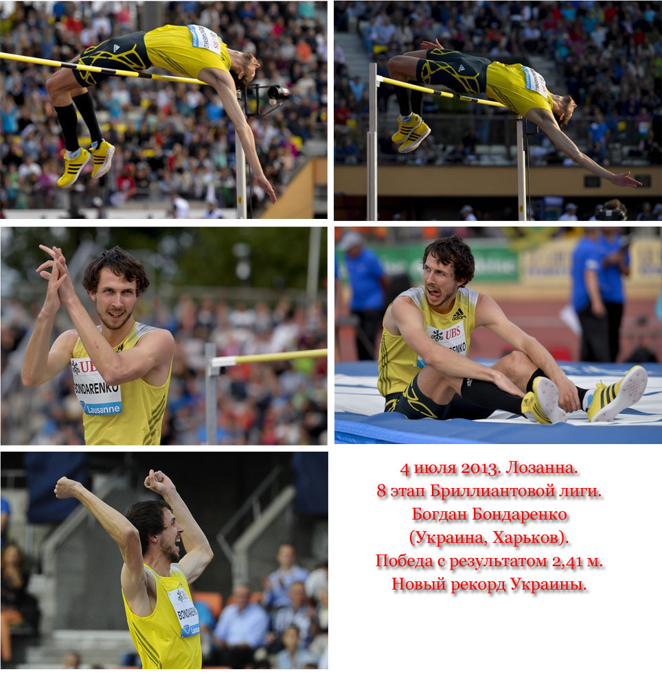 4 июля 2013 года в Лозанне Богдан Бондаренко выиграл соревнования в прыжках в высоту с результатом 2,41 м. Тем самым став:
