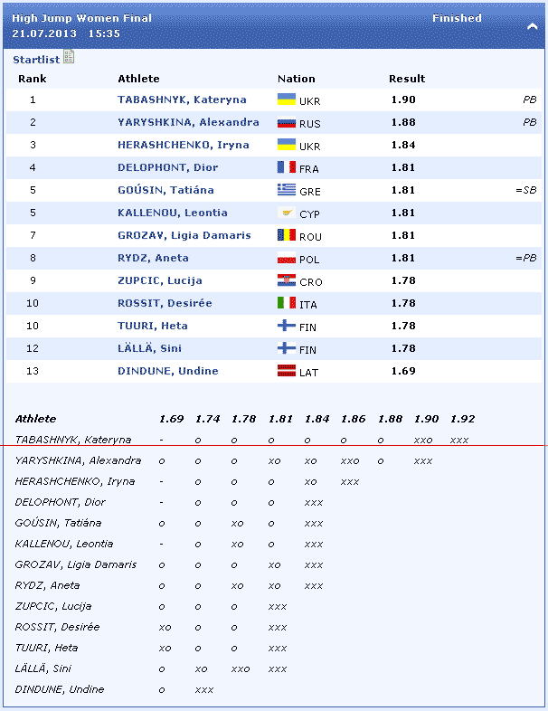 High Jump Women Qualification | 19.07.2013 10:50 | |||