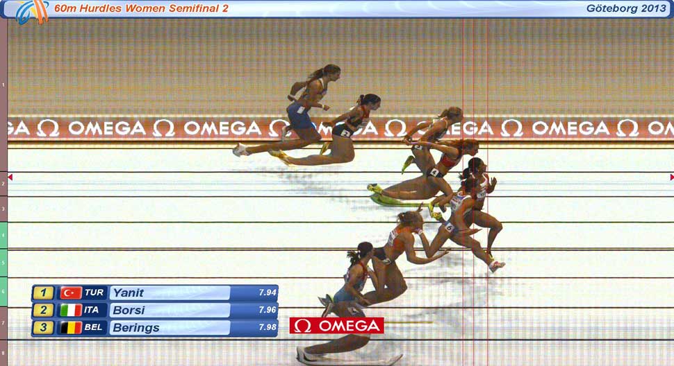 Фотофиниш второго полуфинального забега на 60 м с барьерами
